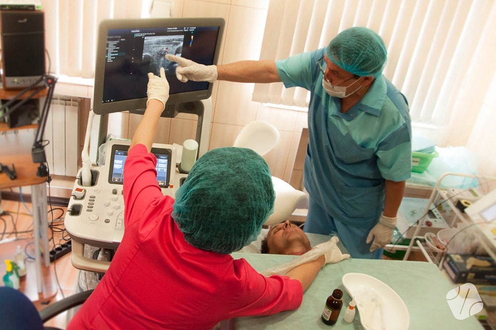 Профессор, доктор медицинских наук Мишагин В.А. проводит манипуляцию на щитовидной железе под контролем УЗИ