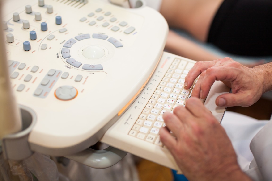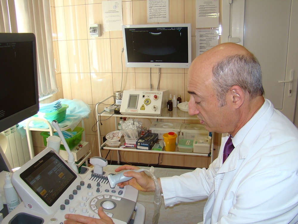 Научный руководитель клиники к.м.н. Агаев А.А. проводит ультразвуковое исследование на аппарате УЗИ 4Д