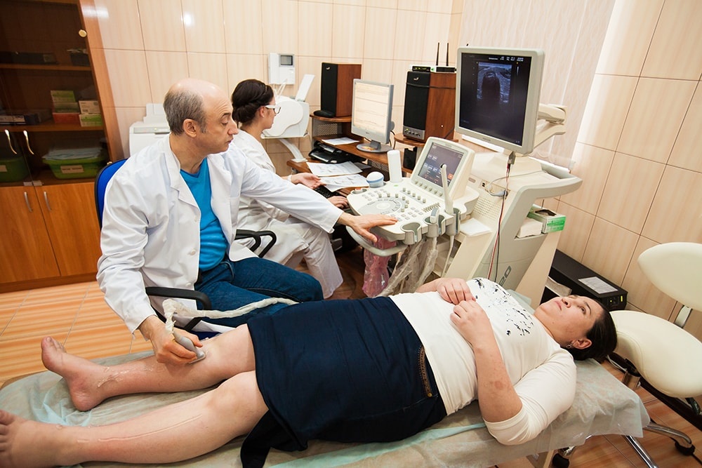 Научный руководитель клиники к.м.н. Агаев А.А. проводит УЗИ сосудов ног