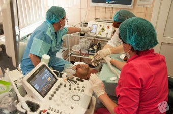 Врачи клиники к.м.н., научный руководитель клиники Агаев А.А. и д.м.н. профессор, д.м.н. Мишагин В.А. проводят практические занятия по ультразвуковой диагностики с курсантами цикла усовершенствования врачей